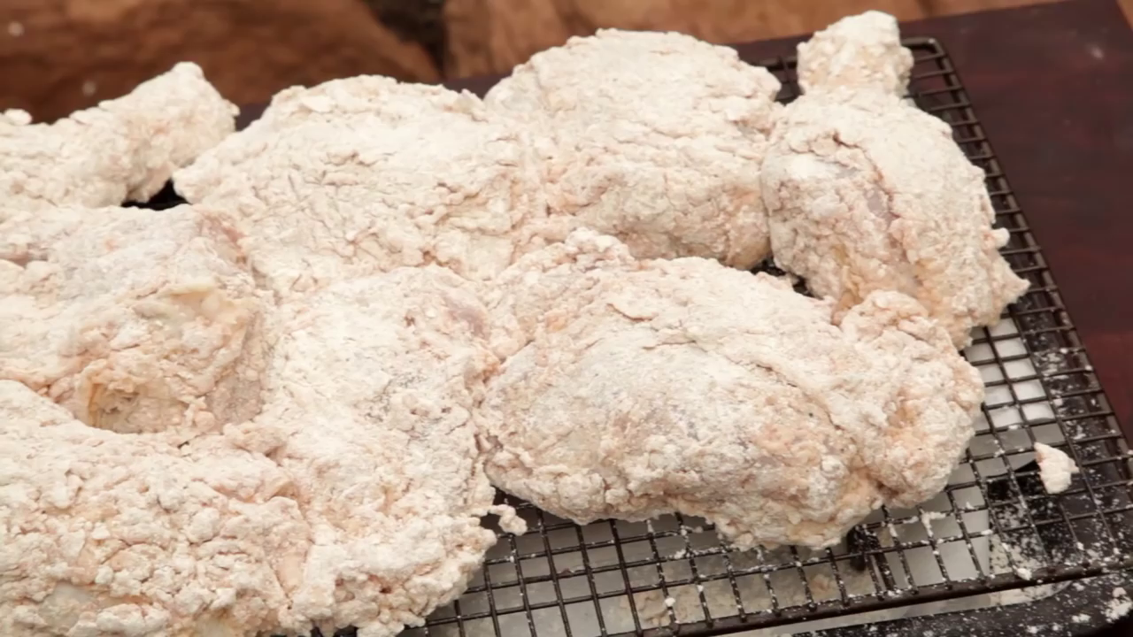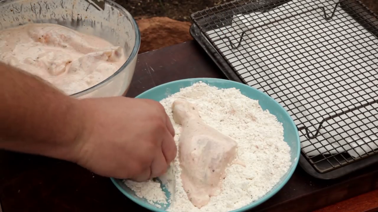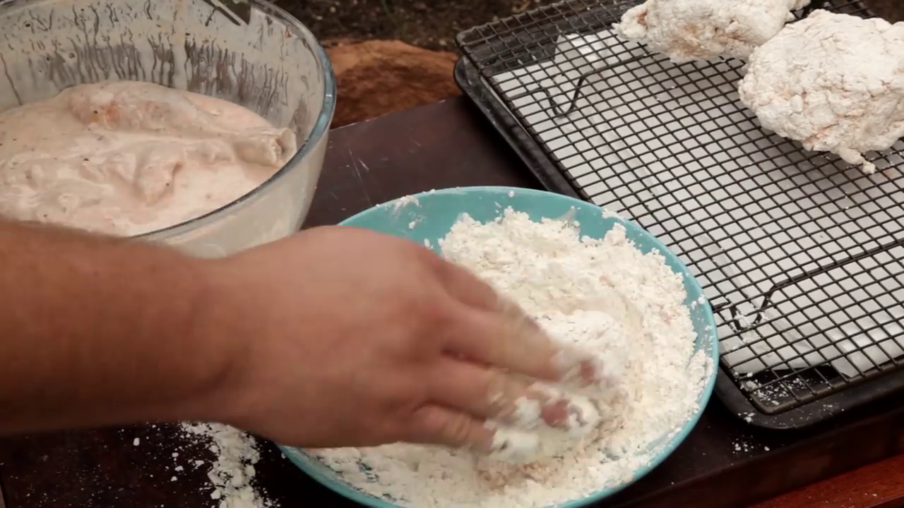 A good trick is to use one hand for the wet chicken and the other hand for the flour. This will help reduce how sticky the process will be.