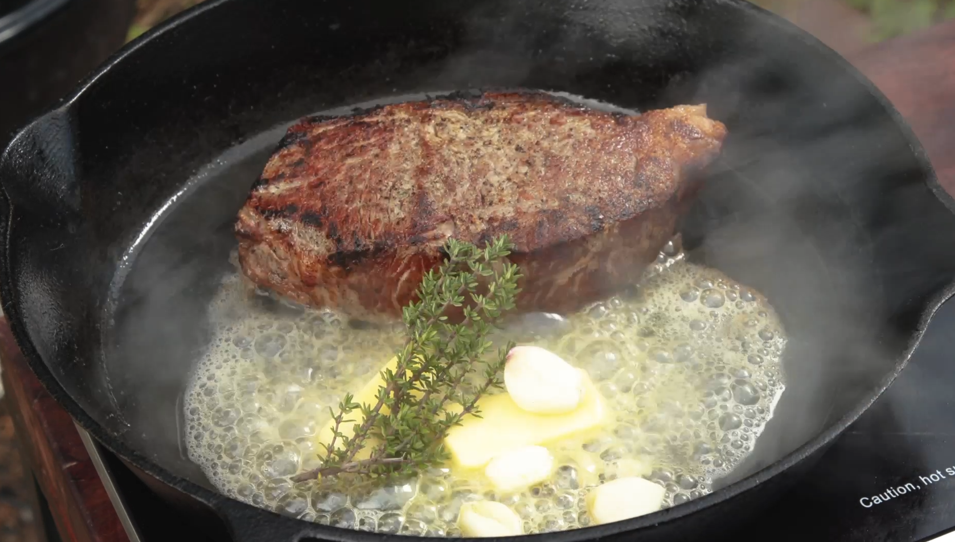 Base the meat by spooning the garlic cloves and thyme onto the top of the steak, followed by the butter. Do this for all sides.