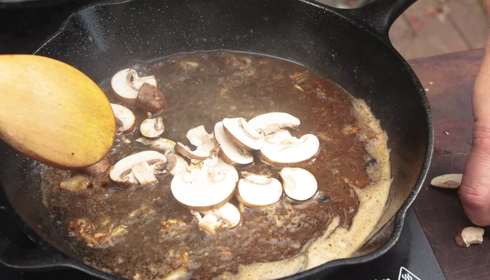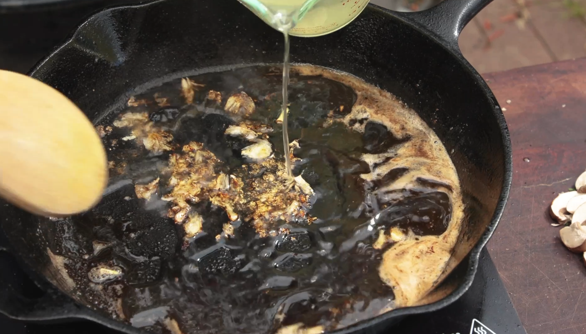 Deglaze the pan with chicken stock then throw in the mushrooms and cook.