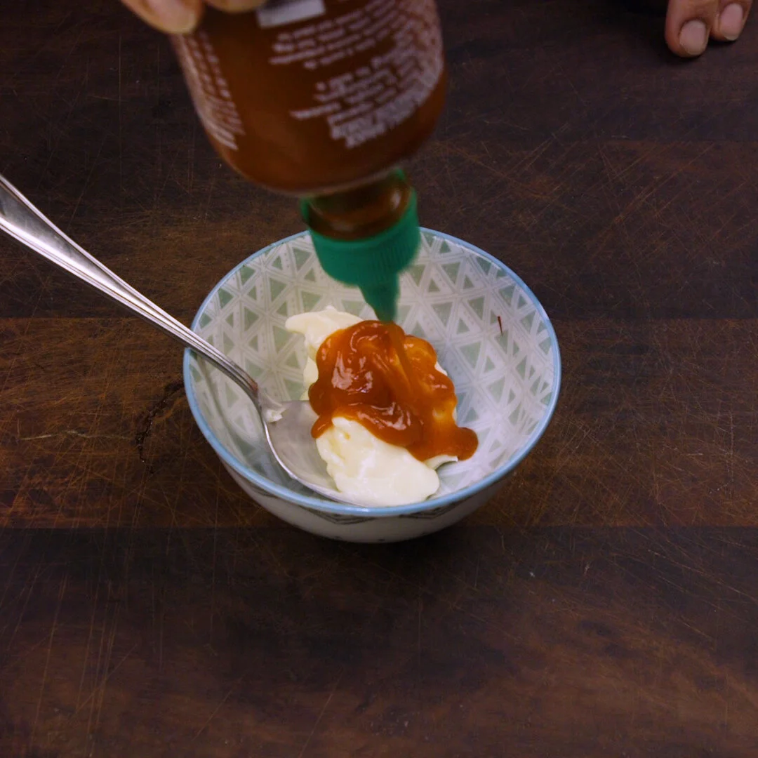 In a bowl add 1 and a half tablespoons of mayonnaise and 1 tablespoon of Sriracha Sauce.