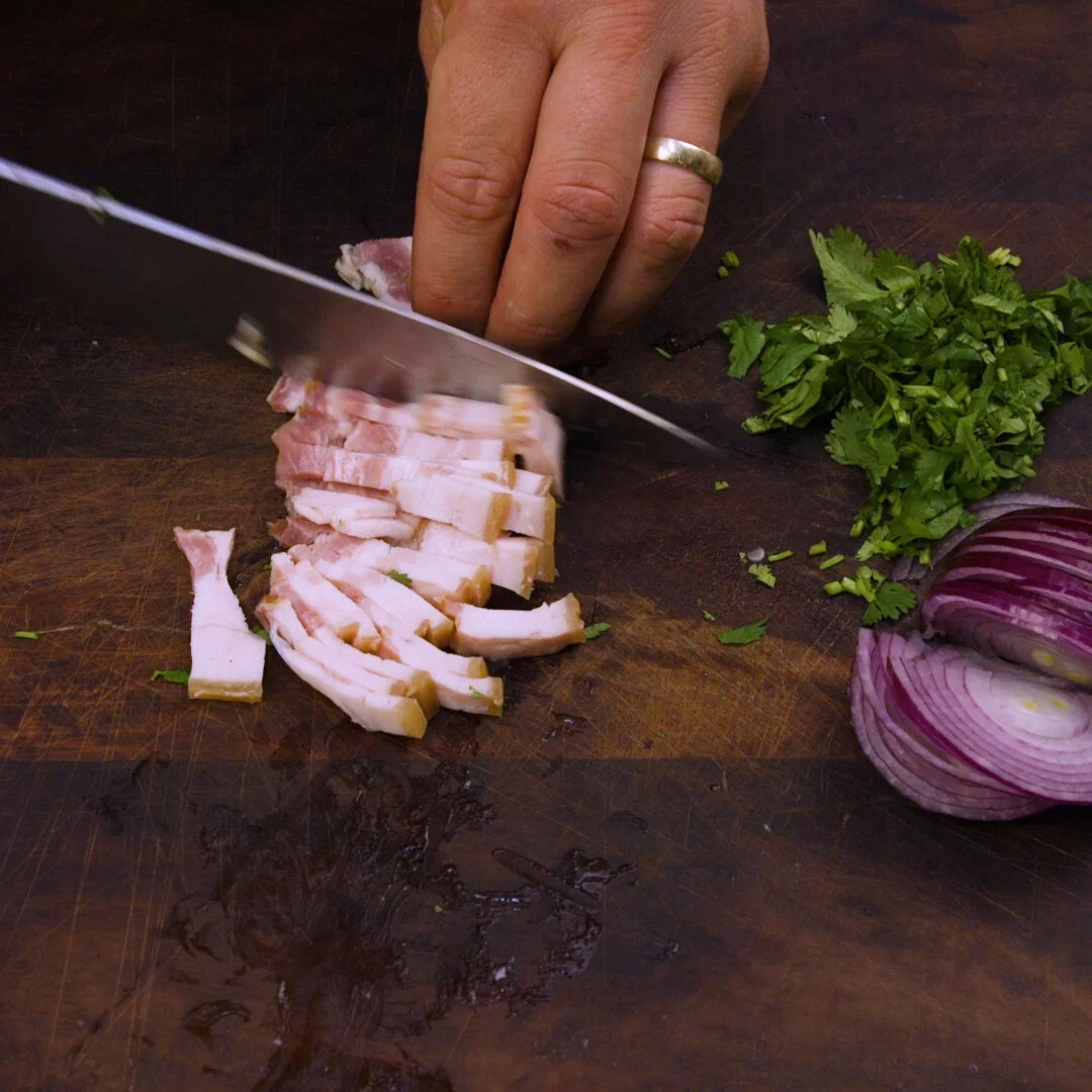 Then dice two strips of bacon. This isn’t going to be a healthy meal, by the way, it’s for the time when you want a treat.