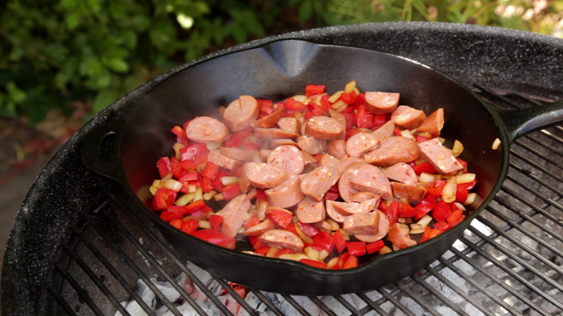 Heat a solid cast iron pan over the charcoal before adding a small amount of olive oil.