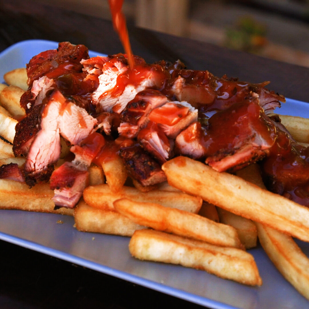 You can eat these beautiful nuggets of tender meat just by themselves but my favourite way to eat them is laid out on a bed of fries salted with chicken salt and topped with some sticky BBQ sauce.