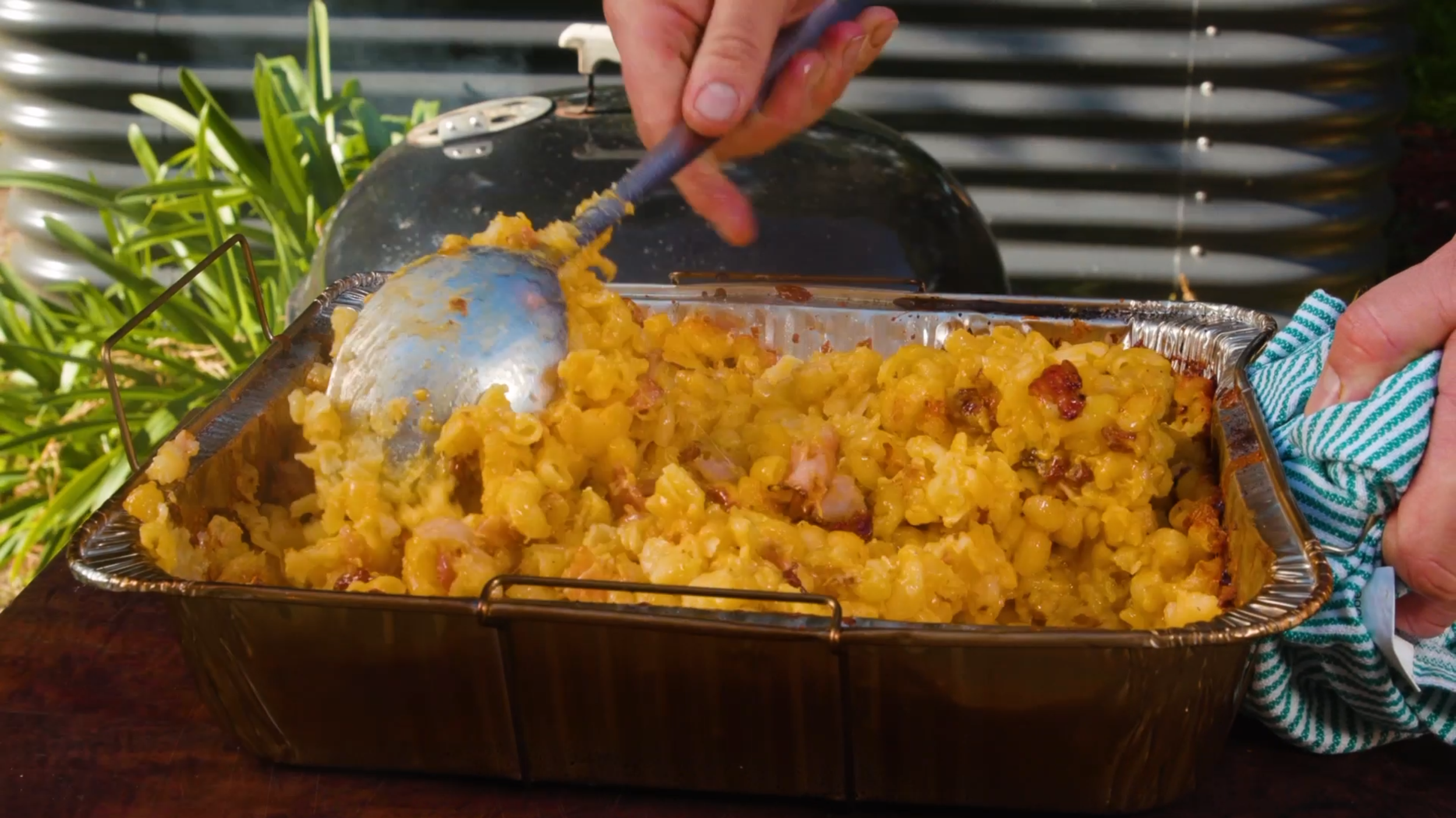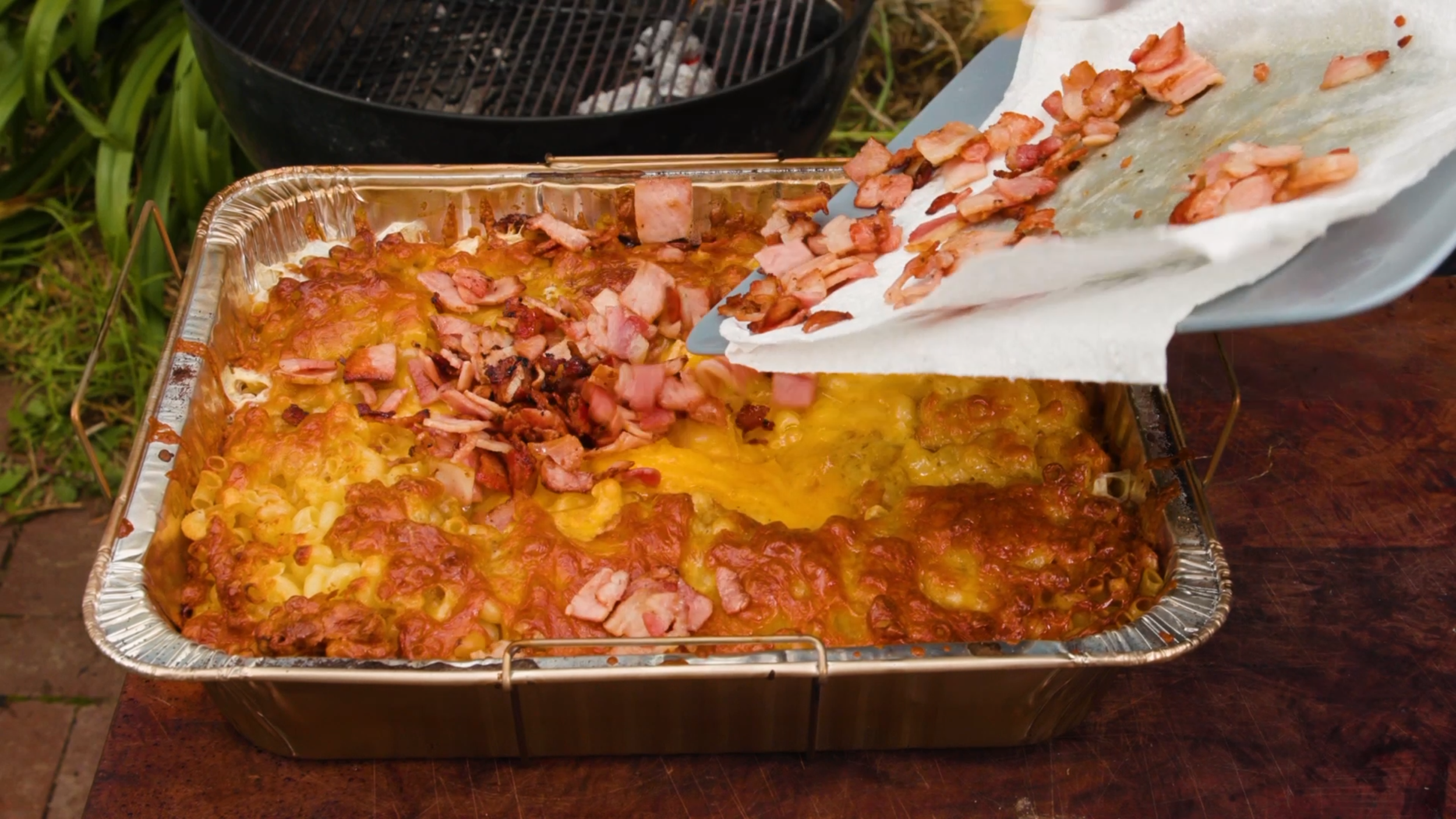 Next up is to check on the mac n cheese, mix everything up and stir in the bacon.